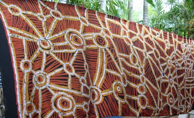 Estelle Munkanome began working with the Ngaruwanajirri Art Centre, Bathurst Island, in 1996. Her early works with natural ochres were very delicate but her later paintings became bolder in line, colour and dot. The structure and ideas in Estelle`s paintings are often reflected in her batiks on silk, using both Naphthol dyes and Drimarine K dyes.