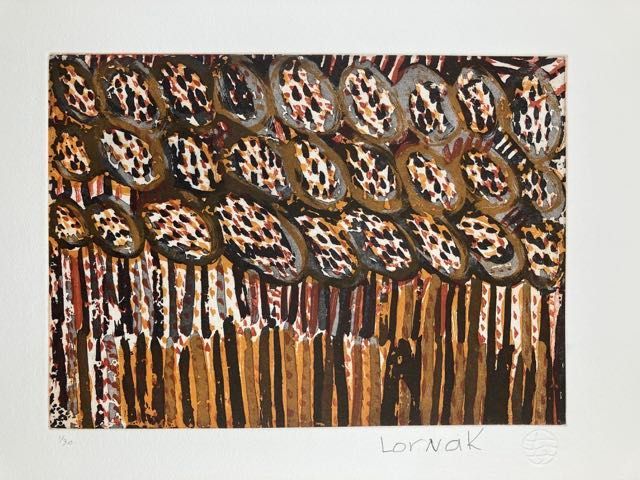 Lorna likes playing cards with her family and hunting on Sundays with family for mud mussels, yuwurli (mangrove worm) and piranga (welk) in the mangroves. Lorna’s work is held in the Batchelor Institute of Indigenous Tertiary Education Collection, the Charles Darwin University Art Collection, the University of Wollongong Art Collection, the University of Newcastle Art Collection Newcastle NSW and the Art Gallery of South Australia.